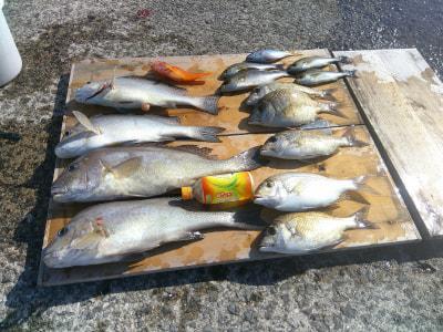 イサギ | 28〜35cm | 12匹 | テンビンズボとウキ釣り ハリス3号 ウキ下13ヒロ | オキアミ |