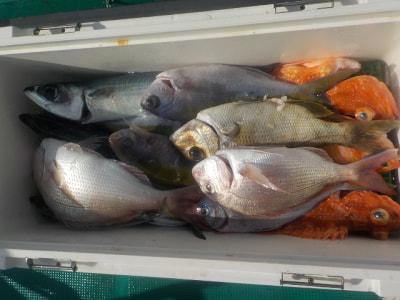 | 五目釣りでオキアジ、ハマダイは釣れなかったが他 魚種多彩に釣れました 今日もシマアジのアタリはナシ |