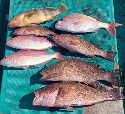 | 山口様ら2名、ハタ28〜47cm4匹、イトヨリ37cm2匹、青ハタ37、マダイ40cm各1匹釣りました。 |