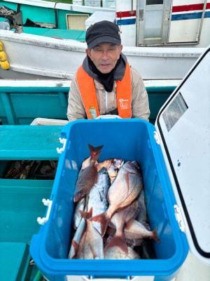 チダイ | 25〜30cm | 10〜20匹 | 竿釣り、天秤3本針、鉄仮面100号 | アミエビ・オキアミ |