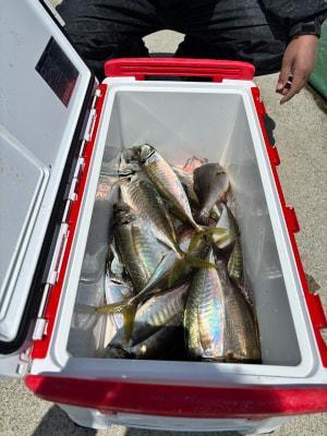 ジャンボアジ | 45〜50cm | 12匹 | 竿釣り、天秤3本針、鉄仮面120号 | アミエビ |