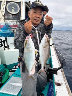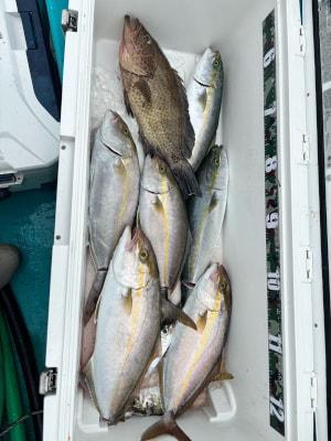 カンパチ | 40〜50cm | 14匹 | 竿釣り、落とし込み仕掛け、オモリ50号 | 小アジ |