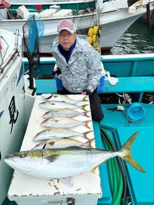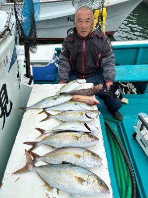 カンパチ | 45〜50cm | 9匹 | 竿釣り、落とし込み仕掛け、オモリ50号 | 小アジ | |