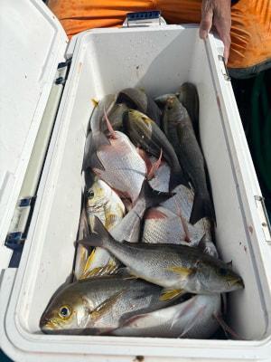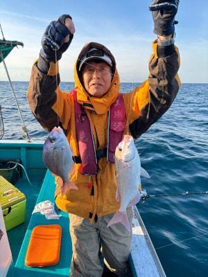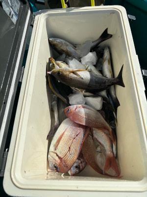 イサギ | 26〜36cm | 15〜20匹 | 竿釣り、天秤3本針、鉄火面100号 | 撒き餌:アミエビ・刺し餌:オキアミ |